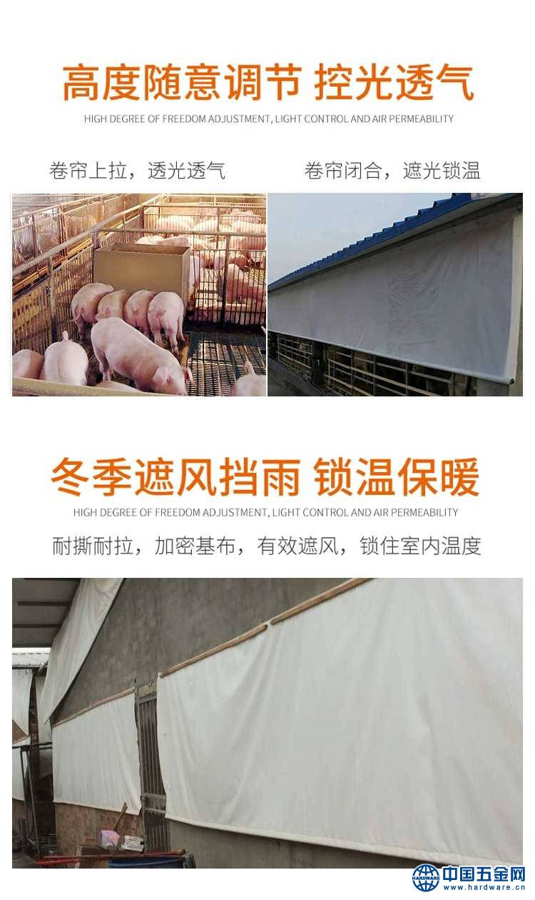 猪场卷帘布从半成品到产品经过:开料-热合-车边-打包等工序加工而成。配置卷帘机安装后能像窗卷帘一样上下卷动,方便操作,为养殖户养殖带来更高效益。养殖卷帘、手摇卷帘机械安装方便简单(我们可提供详细安装说明书)为广大用户节省更多宝贵时间。