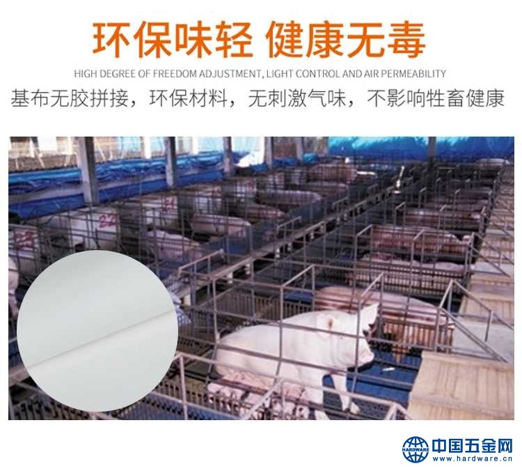 此产品为涂塑PVC高强涤纶丝布料,具有防水,防晒,防风,抗拉,防冻,保暖,耐酸,耐碱,耐磨,抗老化等功能。主要用于养猪场、羊舍、牛棚,家禽养殖业,畜牧养殖业的外墙上,起到冷天下雨保暖防风作用,热天方便卷起来通风认空气流动,对牧畜的健康生长起到了很大的作用。给养殖户带来了更高的效益。