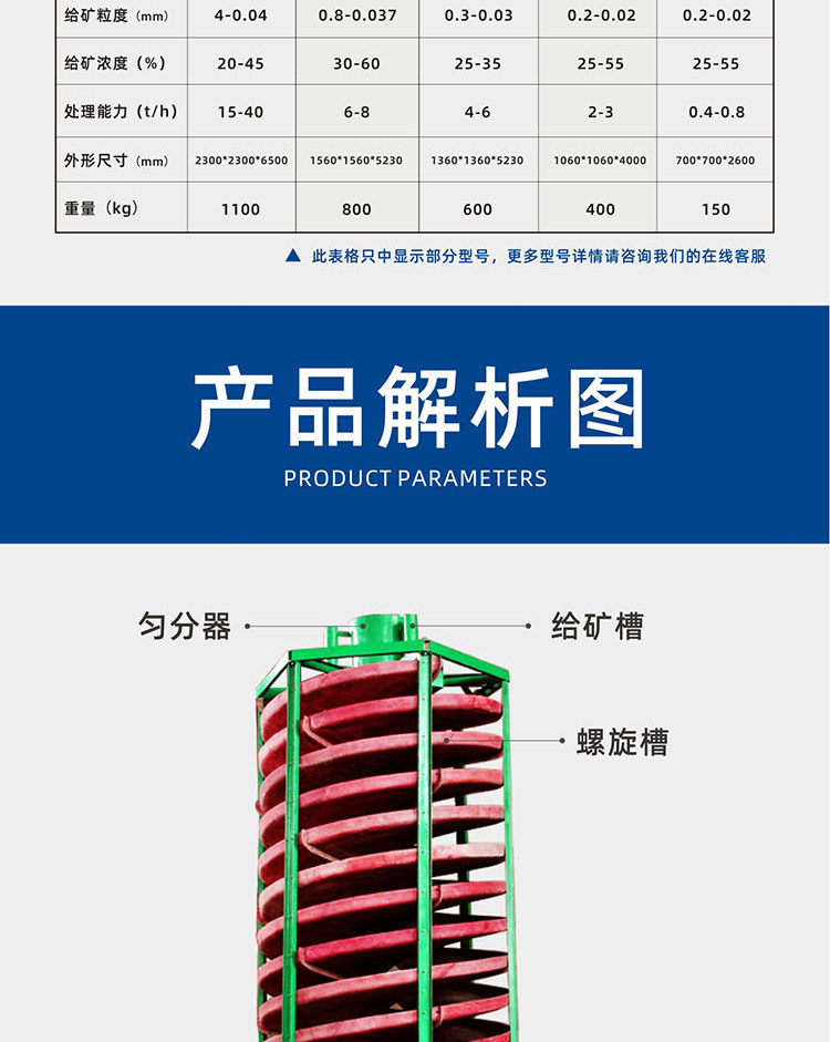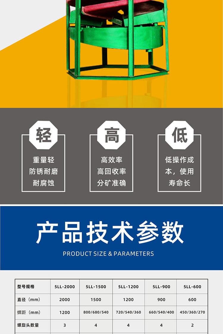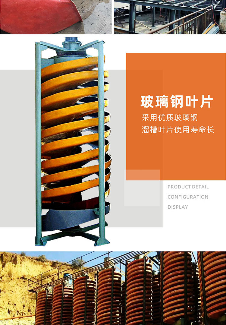 璃钢螺旋溜槽是综合了螺旋选矿机、螺旋溜槽、摇床、离心选矿机的特点的设备,是采矿、选矿的*佳设备,特别是海滨、河畔、砂滩、溪道的砂矿开采更为理想。产品具有结构合理,安装简单,占地面积少,操作简易,选矿稳定,分矿清楚,处理量大,效率高选矿富集比高、回收率高,运转可靠的特点。具有重量轻、防潮、防锈、耐腐蚀,对给矿量和浓度、粒度、品位的波动适应性强,无噪音等优点。