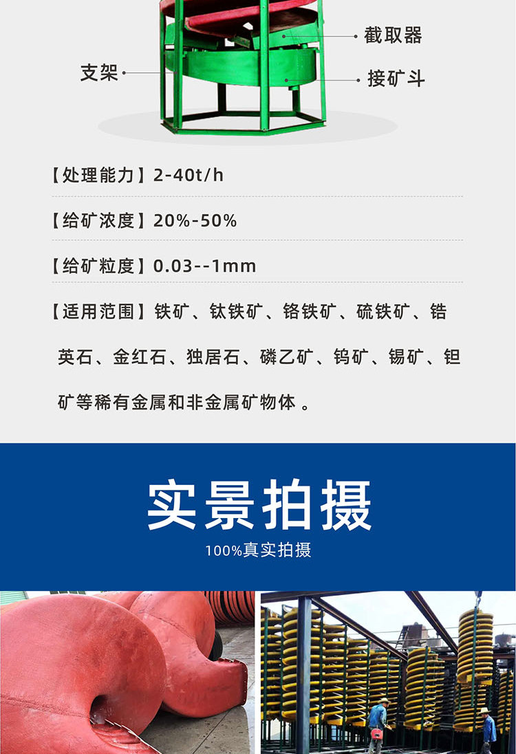 本设备适用于分选粒度0.3--0.02毫米细料的铁矿、钛铁矿、铬铁矿、硫铁矿、锆英石、金红石、独居石、磷乙矿、钨矿、锡矿、钽矿、铌矿以及具有比重差异的其他有色金属、稀有金属和非金属矿物体。本设备具有选别过程稳定、容易控制,给矿浓度允许变化范围大,富集比高、回收率高,占地面积小、耗水量少,结构简单,无需动力,处理量大,安装简易,操作方便,投资小见效快等优点。