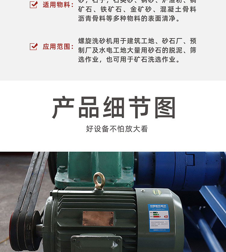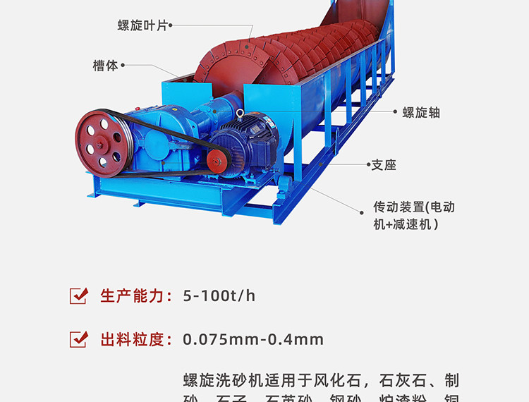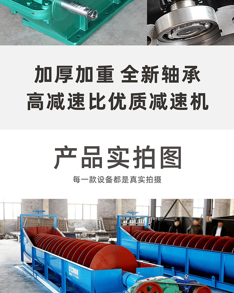 螺旋洗砂机适用于冶金、建材、水电等行业的洗选、分级、除杂等作业,用于细粒度和粗粒度物料的洗选作业。对建筑用砂、筑路用砂石犹为适宜。螺旋砂石洗选机功率消耗小、洗净度高。密封结构好、全封闭传动装置、可调式堰板,确保了产品、耐用、清洗、脱水效果好、细粒产品保持稳定等特点。