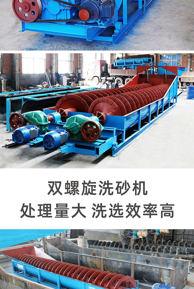 螺旋洗砂机分为单螺旋洗砂机和双螺旋洗砂机两种,主要用于公路,水电,建筑等行业的洗选、分级、除杂,以及细粒度和粗粒度物料洗选等作业。具有功率消耗小、洗净度高。密封结构好、全封闭传动装置、可调式堰板,确保了 设备、耐用、清洗、脱水效果好、细粒产品保持稳定等特点。