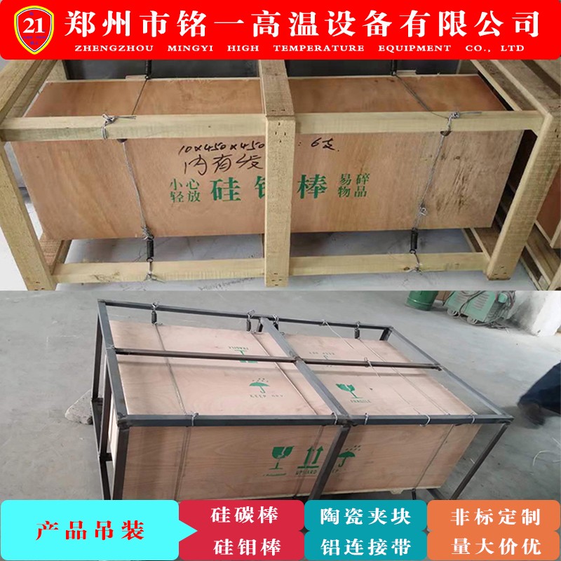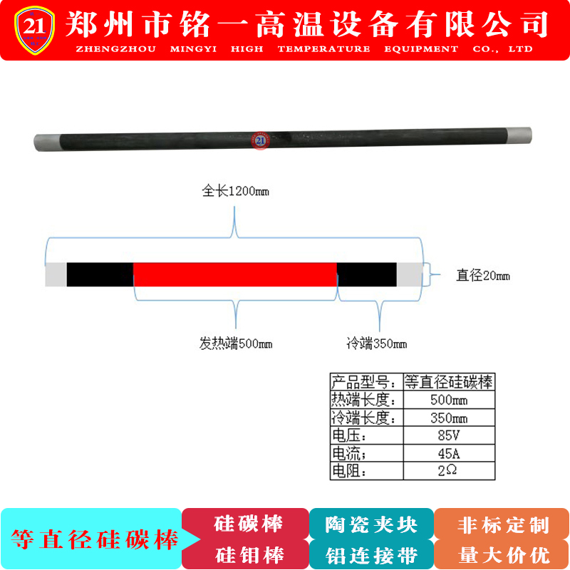 等直径硅碳棒是由一支等直径发热端和两支冷端经过特殊工艺高温焊接而成,具有耐高温急冷急热易安装,密度高发红均匀电阻一致,环保节能工作时间长,升温快规格齐全,非标定制发货周期短等优势,郑州市铭一高温设备有限公司是生产高温电炉加热元件硅碳棒,硅钼棒,不锈钢陶瓷夹,铝编织连接带22年的生产厂家。