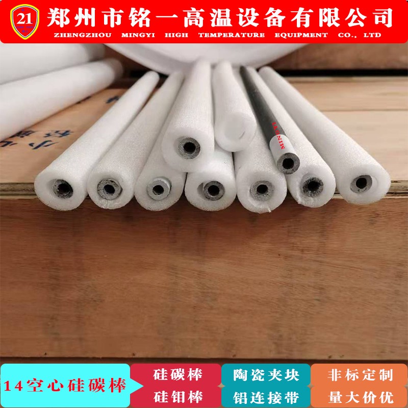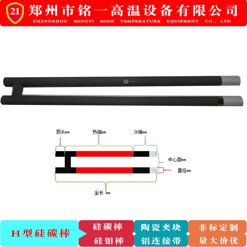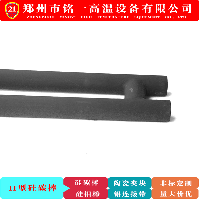 H型硅碳棒是由两支等直径硅碳棒共用一个冷端经过特殊工艺高温焊接而成,具有耐高温急冷急热易安装,密度高发红均匀电阻一致,环保节能工作时间长,升温快规格齐全,非标定制发货周期短等优势,郑州市铭一高温设备有限公司是生产高温电炉加热元件硅碳棒,硅钼棒,不锈钢陶瓷夹,铝编织连接带22年的生产厂家。