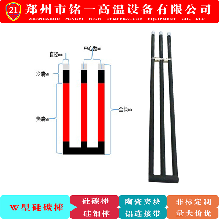 W型硅碳棒是由三支等直径硅碳棒共用一支冷端经过特殊工艺高温焊接而成,具有耐高温急冷急热易安装,密度高发红均匀电阻一致,环保节能工作时间长,升温快规格齐全,非标定制发货周期短等优势,郑州市铭一高温设备有限公司是生产高温电炉加热元件硅碳棒,硅钼棒,不锈钢陶瓷夹,铝编织连接带22年的生产厂家。