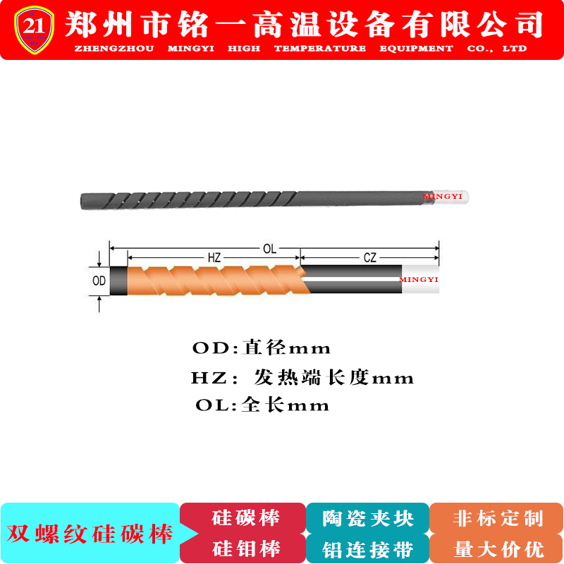 双螺纹硅碳棒是由一支等直径发热端经过特殊工艺高温烧结而成,具有耐高温急冷急热易安装,密度高发红均匀电阻一致,环保节能工作时间长,升温快规格齐全,非标定制发货周期短等优势,郑州市铭一高温设备有限公司是生产高温电炉加热元件硅碳棒,硅钼棒,不锈钢陶瓷夹,铝编织连接带22年的生产厂家。