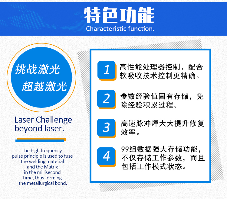 1、 精密脉冲点焊:本模式下的焊补精度达到或超过激光的焊补精度