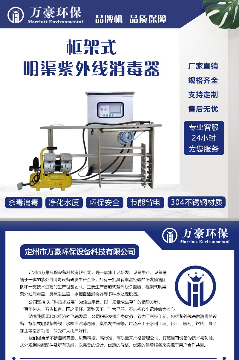 1、框架式紫外线消毒器适合于工业废水排放、生活污水排放中末端水的消毒处理。适用对象为污水处理厂、工厂和医院等的污水处理站。、