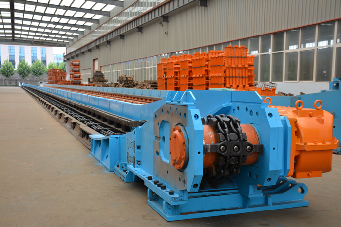 刮板输送机的工作原理是,将敞开的溜槽,作为煤炭、矸石或物料等的承受件,将刮板固定在链条上(组成刮板链),作为牵引构件。当机头传动部启动后,带动机头轴上的链轮旋转,使刮板链循环运行带动物料沿着溜槽移动,直至到机头部卸载。刮板链绕过链轮作无级闭合循环运行,完成物料的输送。