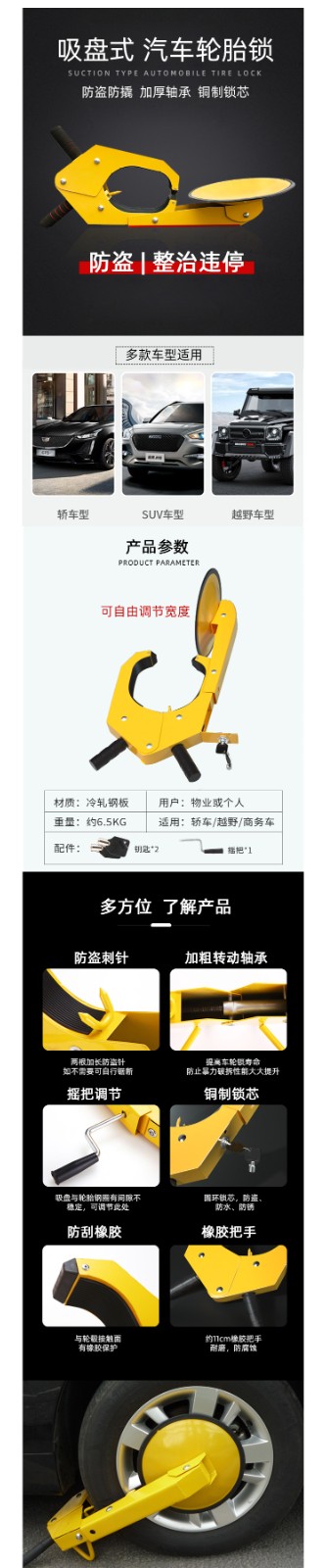 吸盘式锁车器车轮锁汽车货车轮胎牛角锁防盗车锁三叉式加厚车位锁