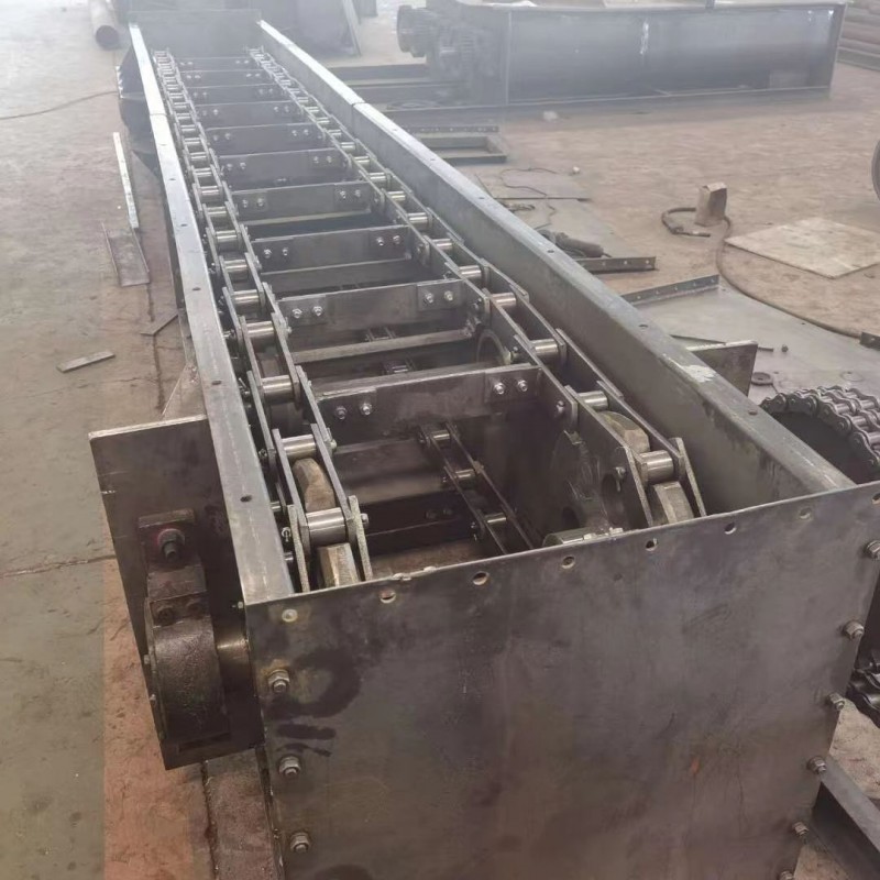 刮板输送机的工作原理是,将敞开的溜槽,作为煤炭、矸石或物料等的承受件,将刮板固定在链条上(组成刮板链),作为牵引构件。当机头传动部启动后,带动机头轴上的链轮旋转,使刮板链循环运行带动物料沿着溜槽移动,直至到机头部卸载。刮板链绕过链轮作无级闭合循环运行,完成物料的输送。