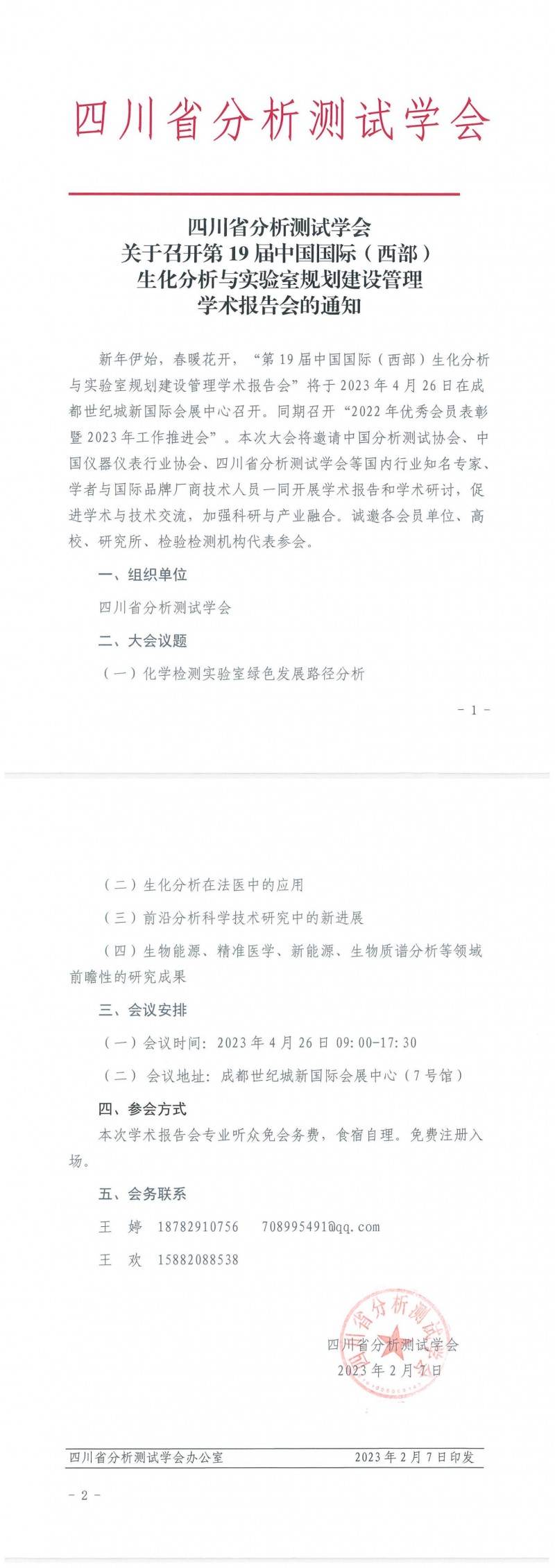 新年伊始,春暖花开,“第19届中国国际(西部)生化分析与实验室规划建设管理学术报告会”将于2023年4月26日在成都世纪城新国际会展中心召开。同期召开“2022年优秀会员表彰暨2023年工作推进会”。本次大会将邀请中国分析测试协会、中国仪器仪表行业协会、四川省分析测试学会等国内行业知名专家、学者与国际品牌厂商技术人员一同开展学术报告和学术研讨,促进学术与技术交流,加强科研与产业融合。诚邀各会员单位、高校、研究所、检验检测机构代表参会。