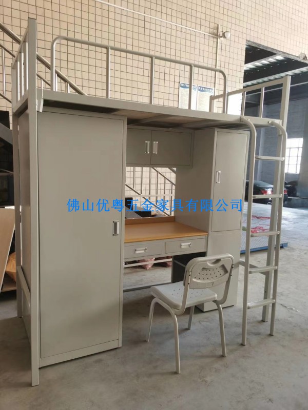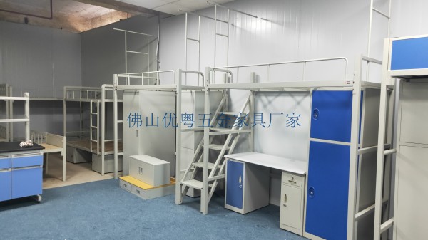 学生连体公寓床是由床、书柜、衣柜、书桌和梯架组成。书柜和衣柜连接在床架床腿内侧,书桌将书柜、衣柜连在一起。由于床是立体空间组合,不仅节省了空间,而且整齐美观