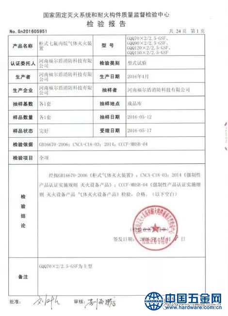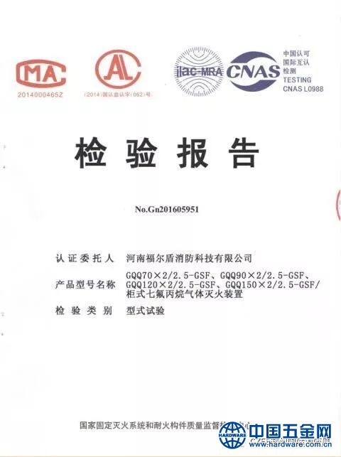 福尔盾科技集团研发的【柜式七氟丙烷自动灭火装置双瓶组/单瓶组】产品已获得由国家固定灭火系统和耐火构件质量监督检验中心颁发的柜式七氟丙烷双瓶组检验报告。此次产品型号分别是GQQ70*2/2.5-GSF、GQQ90*2/2.5-GSF、GQQ120*2/2.5-GSF、GQQ150*2/2.5-GSF/柜式七氟丙烷气体灭火装置。