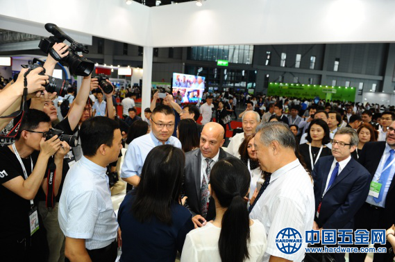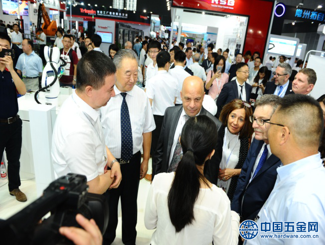 图为CIROS2017现场中国机械工业联合会会长王瑞祥巡馆