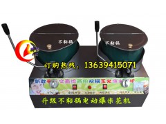 新款不粘锅交直流两用双锅玉米爆花机,在原来的基础上质量升级,设计改良,使用更加方便。仍是以液化气为热源,交流220v或者12v电瓶为搅拌动力,一人就可以操作方便流动。机器采用不锈钢板压模成型,制作爆米花的锅体新增纳米不粘层材质,更方便、更卫生、更实用!内置钢支架、电子点火、火力大小可调,锅底设计为曲线形,火势均匀更节约液化气!新款双锅玉米爆花机,双灶头控制,各自独立工作,互不影响。锅盖上增设 耐高温玻璃观察孔,能轻松的观察爆米花锅内的情况,一锅3分钟即可搞定,做爆米花就是这么简单!锅口新改良为鸭嘴形,只需轻轻压下扳手,一锅香喷喷的爆米花即可倾倒而出,省时省力。