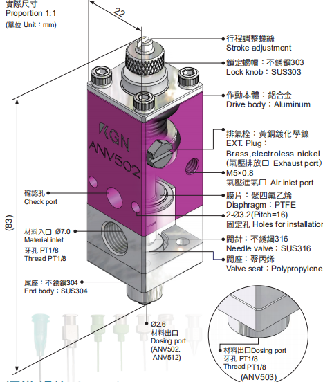 ANV502属于空压作动式阀,用0.39MPa以上的空气就可开启阀,並可通过內藏弹簧关闭阀。