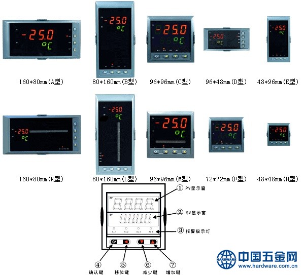 ■概述 HD-S5100系列单回路数字显示控制仪针对现场温度、压力、液位、速度等各种信号进行采集、显示、控制、远传、通讯、打印等处理,构成数字采集系统及控制系统,广泛运用于电力、石化、冶金、轻工、制药、航空等诸多领域。 ★单路输入,双屏LED数码显示,且带有光柱模拟指示功能(0~100%)。 ★具备36种信号输入功能,可任意选择输入信号类型;0.2%级测量精度。 ★热电阻热电偶信号分辨率可切换:1℃或0.1℃。 ★具备“上下限报警”、“延迟报警”、“断线报警”、“闪烁报警”等报警功能,带LED报警灯指示。 ★具有电压、电流变送输出信号可选。 ★支持RS485、RS232串行接口,采用标准MODBUS RTU通讯协议。 ★仪表可带RS232C打印功能,具有手动打印、定时打印、报警打印等功能。 ★带DC24V馈电输出,为现场变送器配电。 ★输入、输出、电源、通讯相互之间采用光电隔离技术。 ★具备多种外形尺寸及样式供用户选择。 ★参数设定密码锁定、参数设置断电永久保存,具备参数恢复出厂设定功能。 |