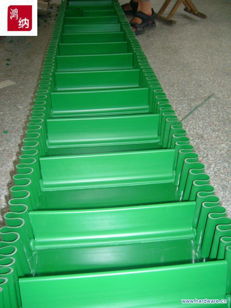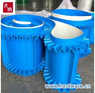 裙边提升输送带(波状挡边输送带),主要有以下三部分组成: 挡边和隔板的底部和基带热硫化成一体,挡边和隔板的高度可以达到40-630mm,在挡边中加贴帆布以加强挡边抗撕裂强度,波状挡边带柔顺灵活,能保证输送带平稳的通过端轮和尾轮。