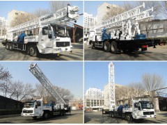 ◎钻机选用重汽6×4专用钻机车底盘,分动箱、主传动系统、变速箱、双卷扬机组、泥浆泵、转盘、钻塔、钢丝绳给进机构等均安装在汽车底盘上;