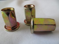 六角拉铆螺母的安装方式与普通铆螺母的安装方式完全一样,只是板孔需要冲成相适配的六角形