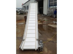 爬坡输送机的主要优点(1)爬坡输送机的输送倾角大,Z大可达90°,是大倾角输送和垂直提升的理想设备。因此可以节约占地面积,节省设备投资和土建费用,取得良好的综合经济效益。(2)结构简单。如前所述,各主要部件均可与通用带式输送机通用,给使用、维修带来方便。(3)运行可靠。它的可靠度几乎与通常带式输送机相等。(4)运行平稳、噪声小。(5)由于不存在装料时的挖掘阻力和运行时物料的内摩擦、外摩擦阻力,因此能耗小。 (6)垂直挡边机还可以在机头和机尾设置任意长度的水平输送段,便于和其他设备衔接