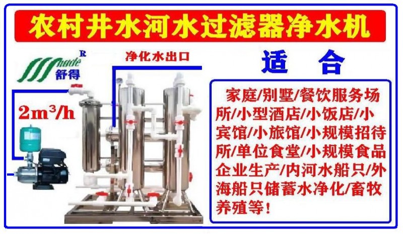 舒得欢迎国内外依靠井水河水雨水等水源赖以生存的人类群体使用舒得牌井水河水雨水等淡水Z业净水设备一家庭安装一套或十家庭组团安装一套(大小规格齐全)舒得牌净水设备就可以天天喝上用上净化水无菌水 而不是城镇市区供应的普通市政自来水可比的、欢迎购买欢迎项目合作。