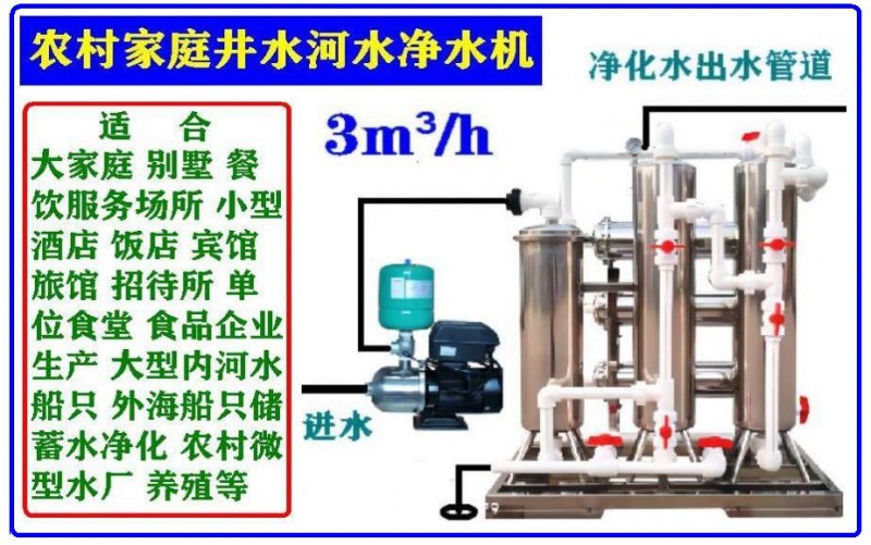 农村山村很多家庭单位餐饮等还是以井水河水为生活用水、因为费用低水源足、地下水河水虽然水源足但是寄生虫、细菌群、大肠杆菌群、钙镁离子、有害的重金属比较严重,在不处理的情况下长期使用比如寄生虫、细菌群、大肠杆菌群、有害的重金属都会直接影响自家人和客人的身体健康,比如钙镁离子直接影响水加热器的结垢、结垢就得多用电费增加费用、而且容易损坏热水器,舒得牌家用净水器是适合农村在生活用水方面的一个改善形态的饮用水净水器,不管家庭使用的自来水还是井水或河水雨水经过舒得牌净水机净化后就可以直接饮用、而且水垢细菌、大肠杆菌都不会再出现、出厂价格发货、没有中间商所以代价很小一次购买使用10-20年应该时间更长。