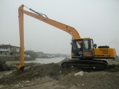 加长臂挖掘机,它是在车体支架及工作臂之间,加装一个加长臂,加长臂由原油缸支撑连接,并在加长臂上加装了一个工作臂油缸及挖掘斗油缸,在驾驶室内外,相应的加装了一套油缸的操纵系统,配合操纵工作臂油缸及挖掘斗油缸的伸缩作业,可使挖掘斗的活动范围扩大一倍以上,达到的范围更高、更深、更远,特别适应矿山、码头、仓储、抗洪抢险及特殊的场合作业,是挖掘机械的一大突破性改造,具有极大的实用价值。