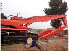 长臂挖掘机,它是在车体支架及工作臂之间,加装一个加长臂,加长臂由原油缸支撑连接,并在加长臂上加装了一个工作臂油缸及挖掘斗油缸,在驾驶室内外,相应的加装了一套油缸的操纵系统,配合操纵工作臂油缸及挖掘斗油缸的伸缩作业,可使挖掘斗的活动范围扩大一倍以上,达到的范围更高、更深、更远,特别适应矿山、码头、仓储、抗洪抢险及特殊的场合作业,是挖掘机械的一大突破性改造,具有极大的实用价值。