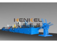 不锈钢管经清洗并被吹干后进入在线固溶化系统,通过调速系统使在加热炉内的不锈钢管带有一定的张力(1%左右)。热处理系统与生产线速度相匹配,成品率高。设备操作方便、简单、自动化程度高、加热电源效率高。当生产线发生故障时不会引起电源损坏。固溶化处理系统采IGBT固态感应加热设备,设计功率为160KW,工作频率范围为15-30KHZ.关于IGBT感应。使用纯氢作为冷却还原气体,氢气的消耗量要求:每分钟约过15升(低压状态)尾气自动燃烧。以及压力探测器,监测氢气的工作压力,冷却通道的密封系统安全、稳定、可靠。退火出口温度100℃以下。系统采用闭式循环软化水冷却系统。