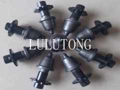 ,并由软性的钴金属将其连结在一起,硬度达到1400HV以上,使其在高温、高冲击的情况下也拥有较好的抗折和耐磨性能。刀尖呈锥形,顶部直径小,确保切入地面时的锥入性能,减少切削阻力;刀尖底部直径大,提供对刀柄的保护。刀尖通过特别的金属钎焊连接在刀柄上,连接强度高,能承受施加在刀尖上,与刀柄成45度方向的6吨力所产生的弯矩。铣刨机刀头的刀柄上下部分有着不同的力学性能,上半部要与路面和铣刨废料产生磨擦,所以需要很高的硬度,下半部的杆插入刀座内,需要能吸收铣刨过程中的冲击,所以韧性好。这样刀柄就需要具有双重性能:耐磨且抗折。中间存在一个退刀槽,可以利用卸刀钳将刀头从刀座中拔出(有的刀头没有退刀槽,使用刀头冲杆将其从后部冲出)。路路通研制生产出新型的刀头,刀柄头部还布有凹槽,增加了与地面摩擦过程中的旋转性能,防止偏磨。为了方便客户, 我厂备有大量现货