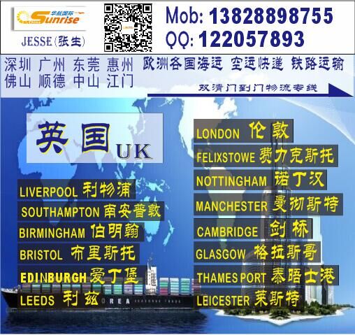 英 国 全境空运、海运、铁路运输,双清到门:FELIXSTOWE(费力克斯托)、SOUTHAMPTON(南安普敦)、LONDON(伦敦)、BIRMINGHAM(伯明翰)、THAMES PORT(泰晤士港)、BRISTOL(布里斯托)、CAMBRIDGE(剑桥)、DOVER(多佛)、EDINBURH(爱丁堡)、LIVERPOOL(利物浦)、MANCHESTER(曼彻斯特)、NEW CASTLE(纽卡斯尔)、LEICESTER(莱斯特)、LEEDS(利兹)、HALIFAX(哈利法克斯)、NOTTINGHAM(诺丁汉)、YORK(约克);