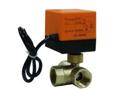 电动三通阀适用于风机盘管水流的通断控制。阀体为黄铜锻造,驱动器利用磁滞同步电机为动力。通电打开阀门,断电后弹簧复们(即断电后阀体自行关闭),并配有手动开阀操作机构,是中央空调系统Z普遍采用的电动阀之一。