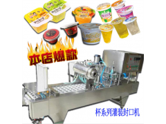 自动落杯→自动灌装→自动封口(卷膜或片膜,卷膜含打码机,紫外线杀菌)→自动切膜→出杯到平台装箱。