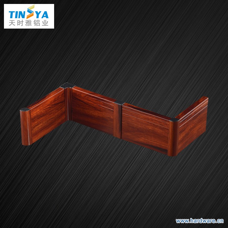 铝合金踢脚线为全铝L型材产品,该型材厚度为1.2mm不等、高度有6cm、8cm、10cm,每条长度均为2.5米,背面的两条固定卡扣槽及防水胶条槽更保证了产品的平整度。目前市场较普遍流行的颜色有亮光拉丝、香槟拉丝、钛金拉丝、欧歌红拉丝、黑钛拉丝、古铜拉丝、铁灰拉丝及各种喷涂氧化,木纹专印 黄檀 红酸枝 水曲柳 黄花梨 柚木等。