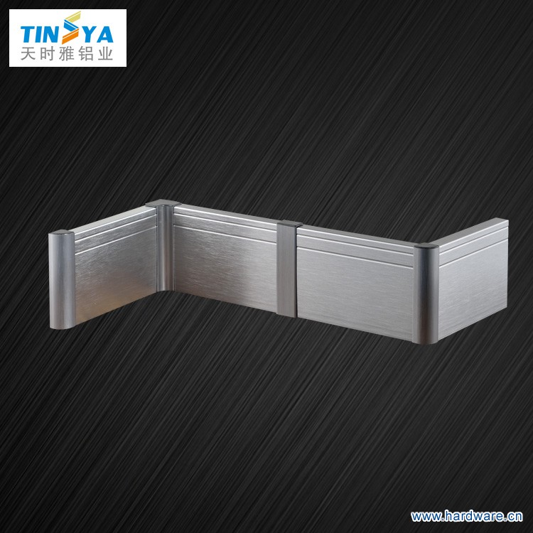 铝合金踢脚线原材料采用国家标准6063-T5铝,该合金具有合金配比硬度达到(13-15)度,使用寿命比一般铝材延长(3-5)倍,其屈服强度可达500Mpa以上。产品经过一系列特殊工艺成型,表面直纹攻丝后进行高温着色氧化,用这种铝生产出来的铝合金踢脚线金属质感强、不褪色、强度高、不变形,防水、防潮、防撞、防虫、防蛀、耐磨、耐老化,安全环保、安装简单、拆卸方便、具有跑线功能、可以重复利用。这都是以往各种材质踢脚线无法做到的。