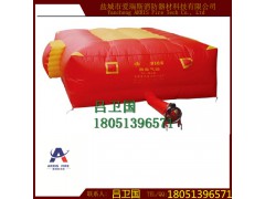 作紧急逃生用。采用具有阻燃性能的高强纤维材料制成。充气垫高2.50M,平面面积Z大可达48㎡,顶面中间部位设有黄色标志和反光标志,使逃生者易于看准目标跳下。