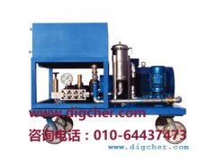 德高洁 DJS 1400/109EM 1400bar压力大流量超高压清洗机(www.digcher.com)采用国产名牌电机作为动力源,高压泵为美国原装进口三柱塞泵,泵进口处配备了介质精滤和有压吸入功能;进出口阀组采用整体组合式;安全阀采用爆破膜式,安全可靠;调压阀为先导式,但结构趋于简单,确保很小的扭矩就能平稳地无级调压。