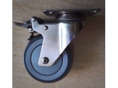 3) 304不锈钢特尔灵TPR:轮体是TPR包PP、尺寸3-5寸、载重100-140KG、特尔灵轴承,安装方式:平底 (无防尘盖) 金属边刹、塑料顶刹