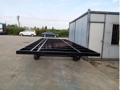 1.载重3吨,主梁用8号国标型钢,台面不铺板,车长5.5米,宽2.5米,高约0.83米,轮胎为4条600-9实心胎,前轮带驻车制动(手刹):