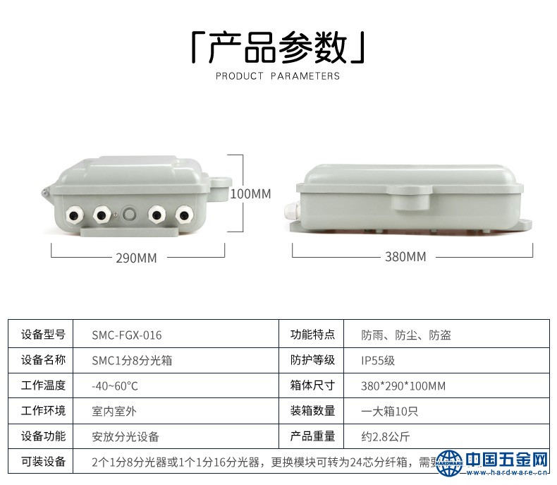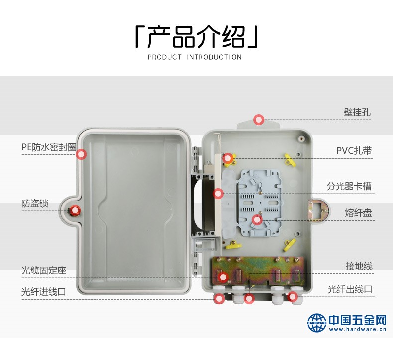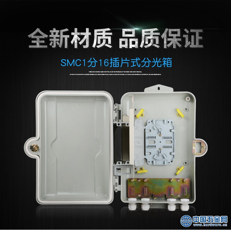 b) 楼道(室内,外)光纤分纤箱箱体其内部金属板材采用Q235冷轧板,厚度不小于1.2mm,表面镀锌处理,箱体上下安装板采用Q235冷轧板,厚度不小于2mm,,采用镀锌后喷塑处理。 室外型另配置抱杆安装铁件,采用不锈钢或铁附件热镀锌处理。