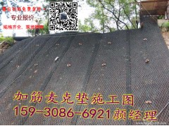 加筋麦克垫包括多个无序排布的防护网丝,所述防护网丝铺设于平面网络状的筋网上(也就是铺设于格宾网片上),并且网丝包覆并粘结于筋网的上下两个表面,可以较好地抵抗剪切应力和拉力,同时还能对植被起到防护作用的优点。加筋麦克垫和雷诺护垫护坡多种生态护岸型式,将现代水利工程、生物科学、环境学、美学等融为一体,为促进河道实现绿荫夹岸、鱼虾洄游生态景观和水利和谐起到了重大作用,这也是现在的生态修复、边坡绿化工程采用加筋麦克垫的原因。加筋麦克垫防护工程由钢丝网箱加上土工麦克垫,一般造价低于刚性材料价格,低于或接近浆砌石价格。特别是在土质,地基基础较差的地段修建防护工程,可缩减地基处理的大笔费用,更加体现其价格低廉的优越性。