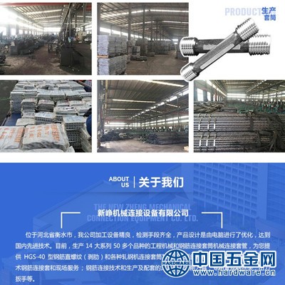 衡水新峥机械连接设备有限公司多年来一直从事钢筋连接套筒系列产品及滚丝机床的生产与研发。公司技术力量雄厚、生产设备齐全、检测手段完备,有健全的管理制度和完善的质量管理体系。目前,公司主要生产14大系列50多个品种的钢筋加工机械和钢筋连接套筒,为您提供HGS-40型钢筋直螺纹滚丝机(剥肋)、40型钢筋直接滚轧滚丝机、HDCJ-32型钢筋镦粗机、钢筋冷挤压机、滚丝轮剥肋刀片等各种钢筋连接机械和400级钢筋连接套筒、500级钢筋连接套筒、钢筋冷挤压套筒、镦粗钢筋套筒、钢筋灌浆套筒、可焊型钢筋套筒以及PC预埋件,螺纹钢型套筒,专用钢筋丝头量规、钢筋套筒量规、工作扳手、检测用扭力扳手等,可加工定做各种异型连接套筒,同时提供各种形式的技术咨询和现场服务。