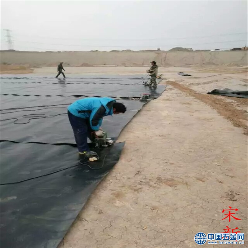 聚乙烯土工膜的焊接施工必须与现场铺膜同步进行,铺一幅焊一幅。边坡土工膜自上而下铺膜,一幅到底不得拼接,上端留下坡肩和锚固量,下端到坑底留头距坡根不小于2米,上下膜端对齐,使用热楔焊机接,坡肩空焊部分用挤押焊机焊接。转角处接缝应尽量避开转角沟,并应尽量将不规则形状减至小,实在避不开转角沟,则必须用挤押焊机焊接此缝。交叉焊缝处,必须用挤押焊机补焊,补焊长度不得低于20公分,补焊前必须对热楔焊缝修剪至露出焊茬,再用手提砂轮将补焊处打干净用挤压焊机补焊土工膜。在边坡土工膜铺焊至20幅时,可对5-15幅埋入锚固沟进行锚固,此后铺焊一幅锚固一幅,两侧始终保持各5幅不锚固,为防风刮起做准备,只用砂(土)袋压即可。