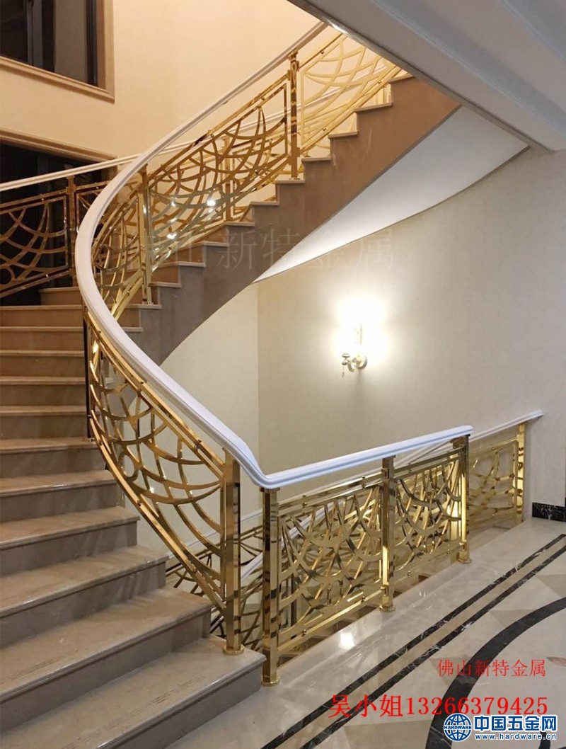 新特新现代铝艺楼梯扶手、雕花铝艺栏杆、铜雕刻镀金扶手楼梯,目前家装市场占有率也挺大,其材质本身给人温暖舒适的感觉,颜色可以多变容易与其它家具搭配,更豪华大气。