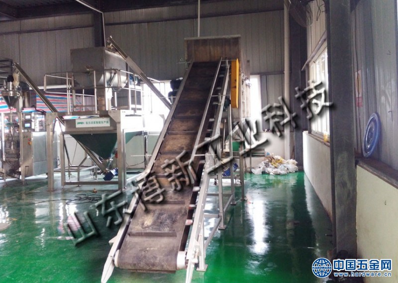 人工将工业碱包装袋放置在输送皮带机上,皮带输送机包装袋送至设备内,由旋转破包装置将包装袋割开,原料由滚动筛筛孔落入出料受料斗内,包装袋由旋转的滚筒旋至排袋机排除,割包产生的扬尘经设备自带的布袋除尘气处理,布袋收集的粉尘通过脉冲清灰装置落入设备内,实现的粉尘的再次利用,经布袋除尘器处理的空气可以直接排放在室内。拆解的原料经出料螺旋,可以配套提升机,螺旋输送机,管链输送机,气力输送,进行配料,搅拌,包装。