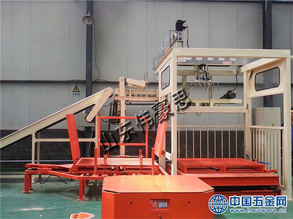 高位粉状涂料包装码垛机工作原理:码垛机是由平板上工件符合栈板要求的一层工件,平板及工件向前移动直至栈板垂直面。上方挡料杆下降,另三方定位挡杆起动夹紧,此时平板复位。各工件下降到栈板平面,栈板平面与平板底面相距10mm,栈板下降一个工件高度。往复上述直到栈板堆码达到设定要求。然后就可以使用叉车将码垛好的产品放到成品仓库里。