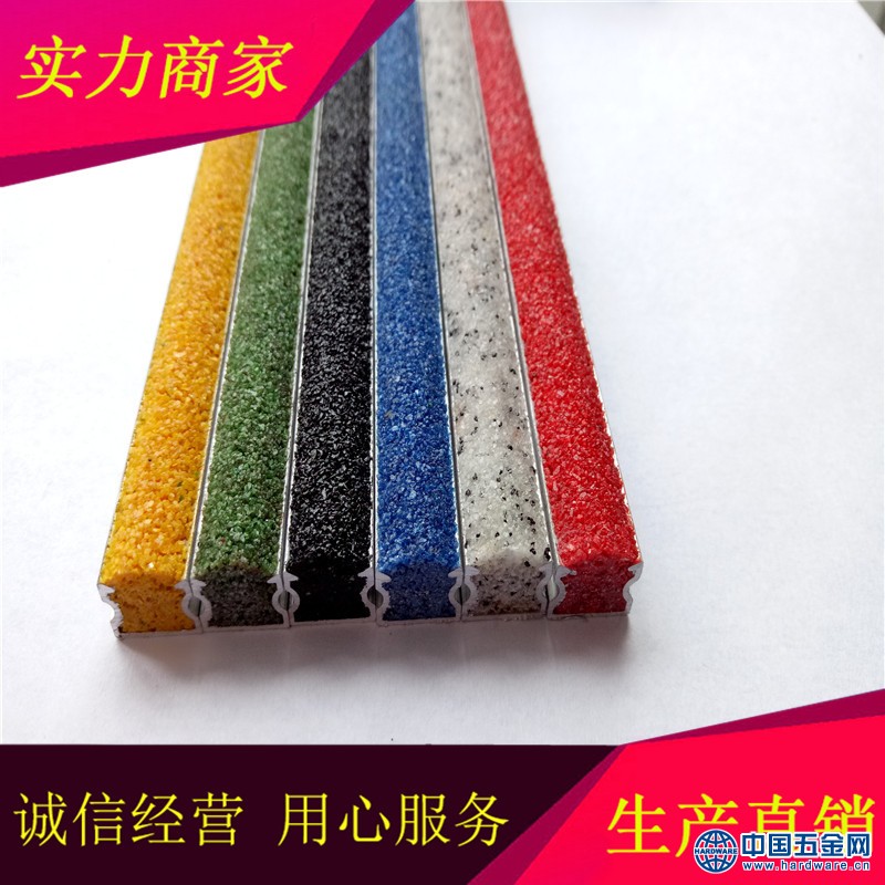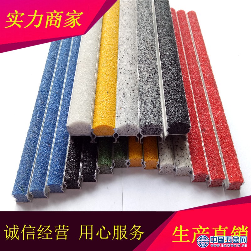 。 底部为耐氧化铝合金,金刚砂色彩多元化可按客户要求定做,常见颜色为:红色、黄色、蓝色、黑色等等。 使寿命长。防滑性能好.防滑条的发货长度在2.5米-3米之间。采用的包装方式是先用珍珠棉单个包裹,避免材料之间相互摩擦,后用纸箱将多个材料包在一起,增加材料的强度,避免运输过程中材料被压坏。