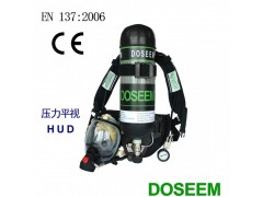 HUD压力平视显示装置装在面具的双目前方,可看到气压显示灯颜色变化,随时提示气瓶使用状态。绿灯:气瓶压力10MPa以上;黄灯:气瓶压力10~6MPa之间;红灯:气瓶压力6MPa以下。